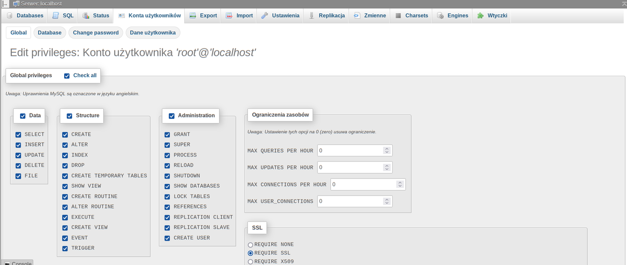 problem w tym, że własnie w phpmyadminie nie mogę robić wielu akcji (zakładać baz, kasować, i wielu poleceń bo wyrzuca że nie mam uprawnień)